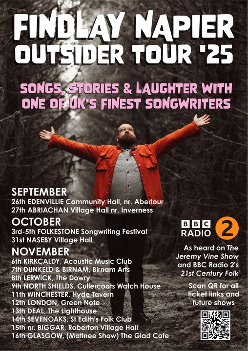 From the Main Stage of Cambridge Folk Festival with folk rock supergroup The Magpie Arc to an intimate acoustic show in the back room of a pub Findlay Napier is widely regarded as one of the finest performers on the UK music scene. This fact was further highlighted when Napier was the first solo act ever to be nominated for Live Act of the Year at the Scot’s Trad Music awards in 2018. Tirelessly creative he has been touring and releasing music since the early naughties. First with groundbreaking trad folk band Back of the Moon, then with Nu-Folk pioneers Findlay Napier and the Bar Room Mountaineers and most recently as a solo act working under the guidance of legendary songwriter Boo Hewerdine.