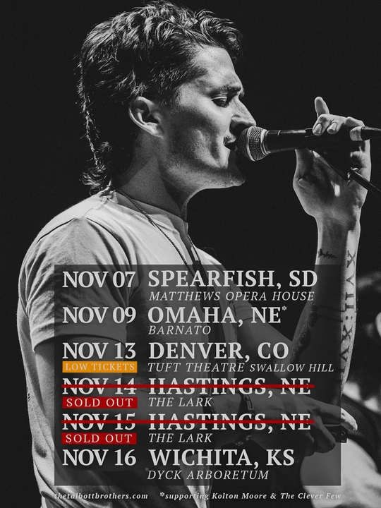 The Talbott Brothers were born and raised in Imperial, Nebraska, a rural midwest town located a stone's throw from the Colorado and Kansas border consisting of two thousand people. Siblings Nick and Ty started writing songs at a young age after discovering their dad’s old guitar and vinyl collection and being introduced to rock and roll, blues and country music. Their song ‘We Got Love’ (2017) brought them national recognition selling out shows across the US and their albums ‘Ghost Talker’ (2019) and ‘Letters’ (2022) garnered attention from 'Rolling Stone,’ 'Billboard' and 'The Boot' calling their music “cinematic,” “captivating blood harmonies” and "for fans of John Mayer, Mumford & Sons and Jason Isbell.”