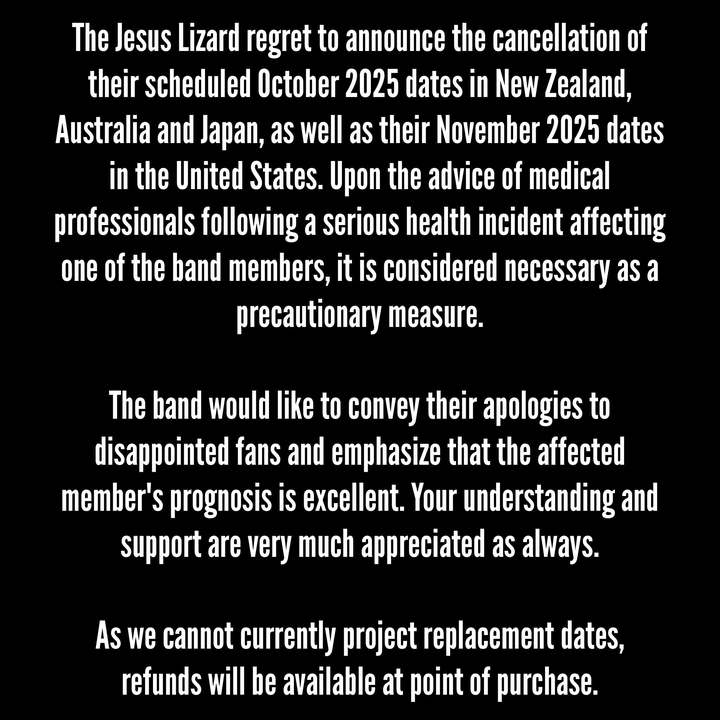 The Jesus Lizard regret to announce the cancellation of their scheduled October 2025 dates in New Zealand, Australia and Japan, as well as their November 2025 dates in thmore