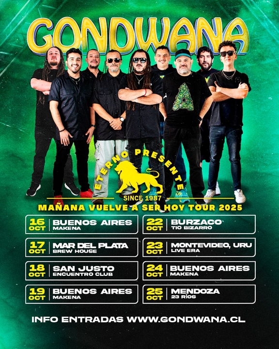 GONDWANA, es sin dudas una de las bandas más fuertes del reggae latinoamericano. Formado en Chile en 1987, el grupo mantiene una trayectoria muy destacada, con ventas multiplatino y presentaciones de los mejores festivales de toda Latinoamérica (Reggae On the River en California, Rock al Parque en Bogotá, Vive Latino en México, Pepsi Music en Buenos Aires, Cosquín Rock en Córdoba, Quito Fest en Ecuador y varias apariciones en el Festival de Viña del Mar son testigos de su impacto masivo).